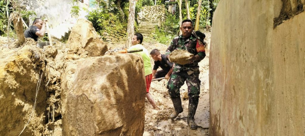 Menanggapi kondisi tersebut, Babinsa bersama masyarakat segera turun ke lokasi untuk membersihkan material yang menimbun jalan.