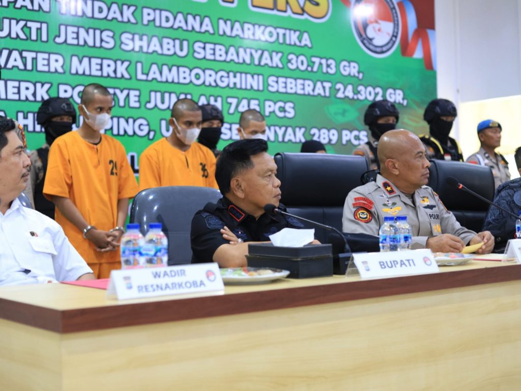 Liputan24jam. MERANTI – Kepolisian Resor (Polres) Kepulauan Meranti berhasil menggagalkan upaya penyelundupan narkotika jenis sabu seberat 30,7 kilogram, cairan ‘Happy Water’ sebanyak 24,3 kilogram, serta 1.034 bungkus catridge liquid narkotika berbagai merek seperti Popeye, Pink, Hijau, Ungu, dan Lamborghini.