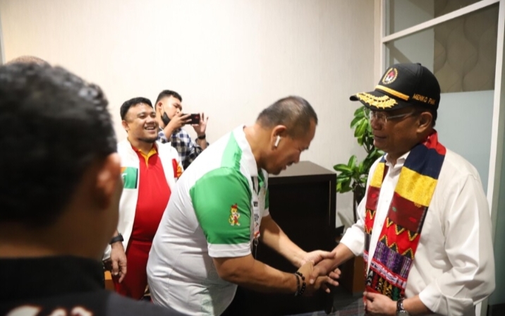 Dalam pantauan wartawan, Baharuddin yang juga calon Bupati Batu Bara itu mengalungkan slempang PON XXI kepada menteri PMK, Muhadjir Effendi.