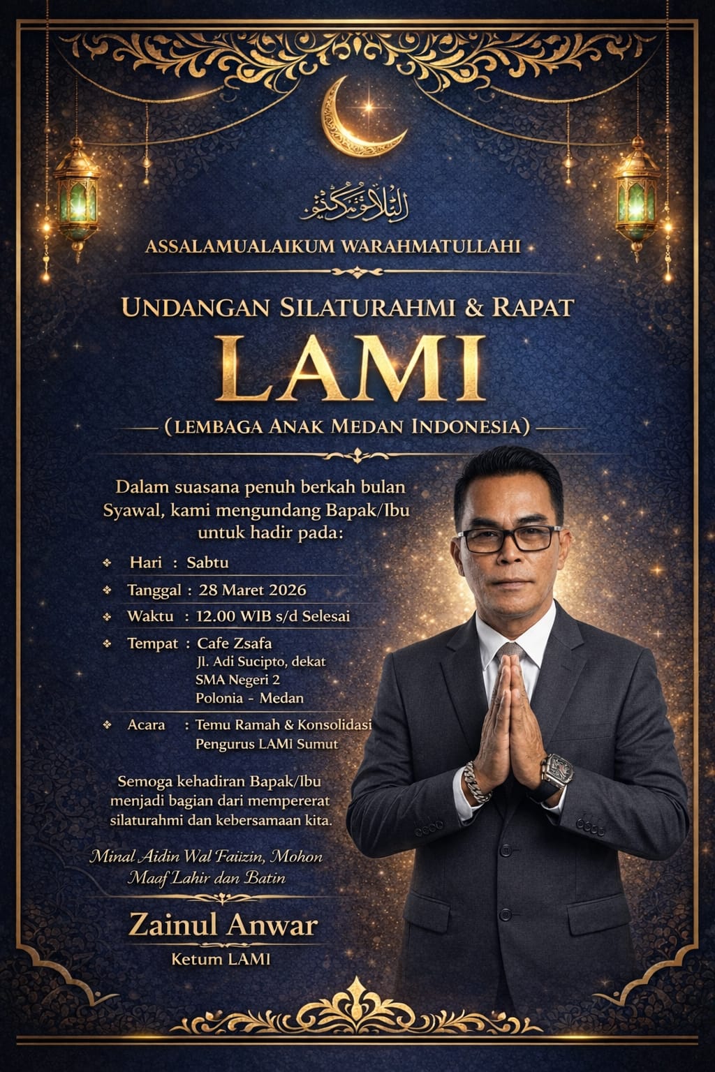 Medan, 28 Maret 2026 — Dalam semangat kebersamaan dan keberkahan bulan Syawal, Lembaga Anak Medan Indonesia (LAMI) menggelar kegiatan Silaturahmi & Rapat Pengurus yang akan berlangsung pada Sabtu (28/3) di Cafe Zsafa, Jalan Adi Sucipto, Medan.