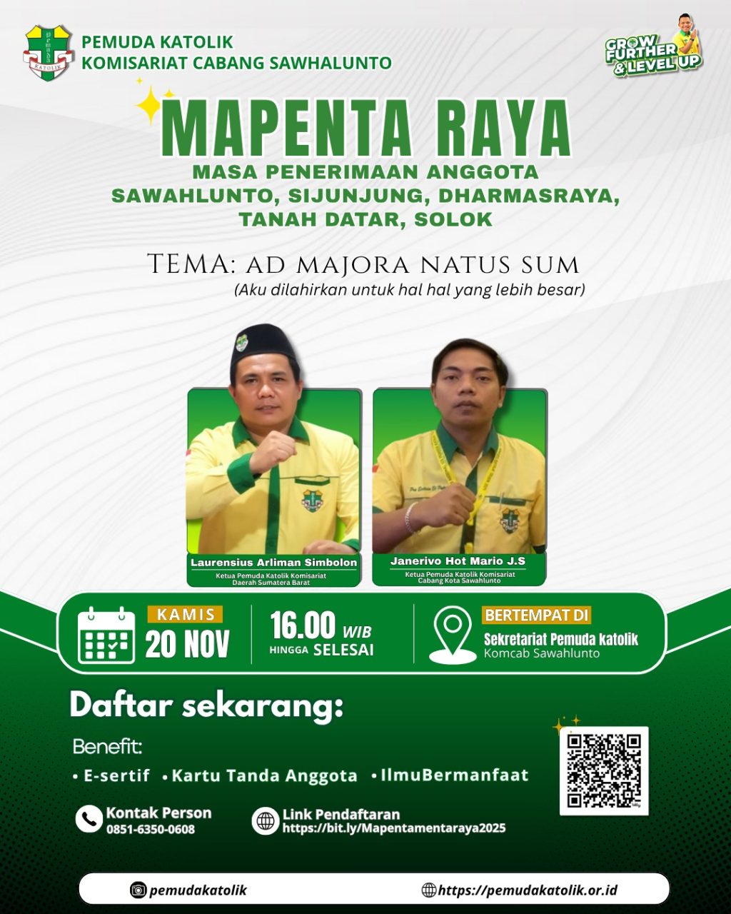 Sawahlunto – Masa Penerimaan Anggota (Mapenta) Raya Pemuda Katolik Komisariat Cabang Kota Sawahlunto resmi terlaksana pada tanggal 20 November 2025. Kegiatan ini menjadi momentum bersejarah karena untuk pertama kalinya Mapenta dilaksanakan dalam skala lintas wilayah yang mencakup lima daerah sekaligus, yaitu Kota Sawahlunto, Kabupaten Sijunjung, Kabupaten Dharmasraya, Kabupaten Tanah Datar, dan Kota Solok. Dengan mengusung tema “Aku Dilahirkan untuk Hal-hal yang Besar”, kegiatan ini membawa semangat pembaharuan, penguatan identitas, dan revitalisasi kaderisasi Pemuda Katolik di Sumatera Barat. Tema tersebut dipilih sebagai bentuk penegasan bahwa setiap kader Pemuda Katolik dipanggil untuk menjadi pribadi yang membawa perubahan positif bagi Gereja dan bangsa.