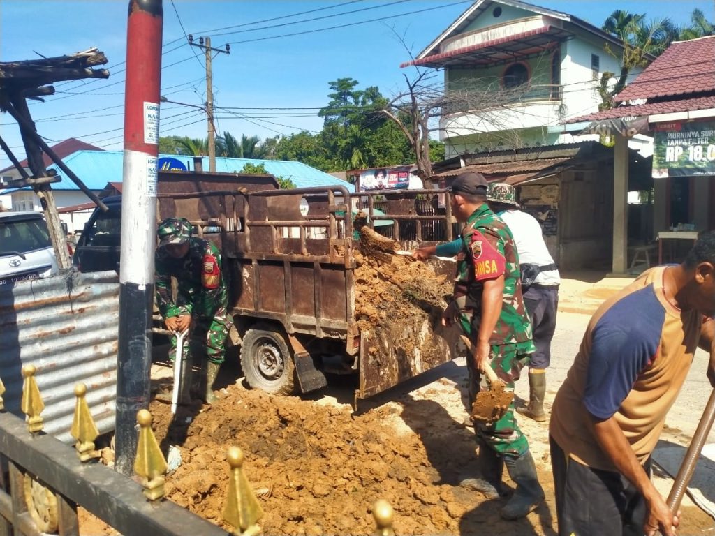 “Kami hadir untuk membantu meringankan beban masyarakat. Pembersihan material banjir ini diharapkan dapat mempercepat pemulihan lingkungan dan memulihkan kembali aktivitas warga” Ujar Danramil